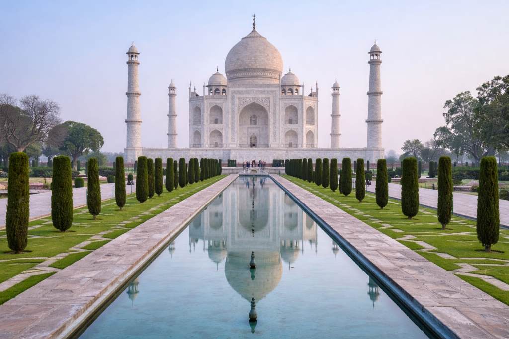 Das Morgenlicht verleiht dem weißen Marmor einen sanften Glanz und hebt die detailreichen floralen Verzierungen sowie die vollkommene Symmetrie hervor. Spiegelbecken verstärken die ruhige Atmosphäre der Anlage. In der Nähe bietet das Itimad ud Daulah Mausoleum, oft als Baby Taj bezeichnet, weitere Einblicke in die Architektur und Gestaltung der Mogulzeit.